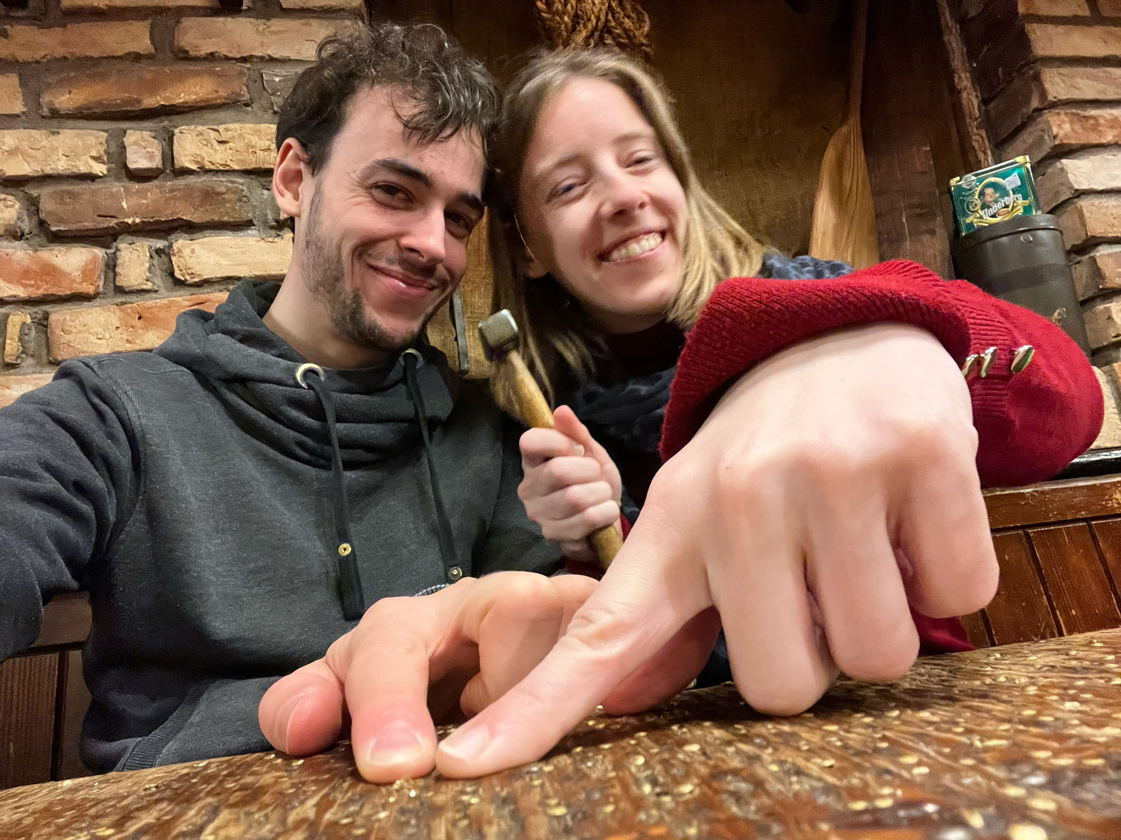Kennengelernt haben wir uns als Tina-Tintenfisch und Anton-Ananas. Danach brauchte es viele Jahre und eine globale Pandemie, um uns näher zu bringen. An einem lauen Sommerabend auf (jetzt) unserem Balkon schlug der Funken dann endlich über. Von dort an machten wir uns gemeinsam auf, die Dinge im Leben zu entdecken, die uns gefallen. Spontan mal die Alpen durchqueren oder mit dem Rad nach Sylt fahren? Kein Problem, morgen geht es los! Auf unserer längsten und abenteuerlichsten Reise nach Nepal sollten wir nicht nur den bisher höchsten Punkt unseres Lebens besteigen, sondern auch zu dritt wieder nach Hause kommen. Kurze Zeit später kam Hannes zu uns. Im Herbst desselben Jahres war es dann so weit: Tina stellte am Strand in Zinnowitz die große Frage. Nach unserer standesamtlichen Hochzeit am 30.12.24 freuen wir uns darauf, uns noch einmal vor allen Freunden und der Familie das Ja-Wort zu geben.